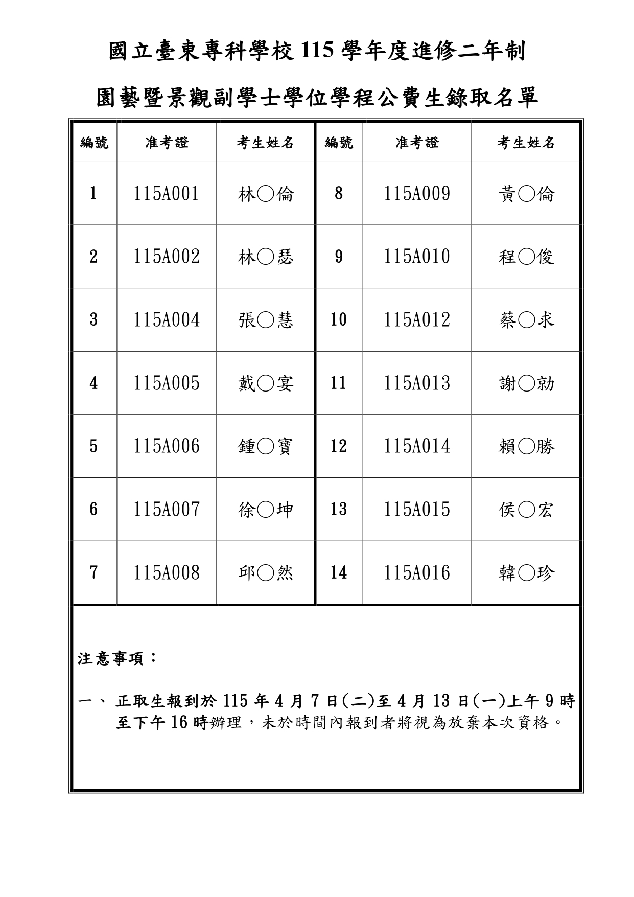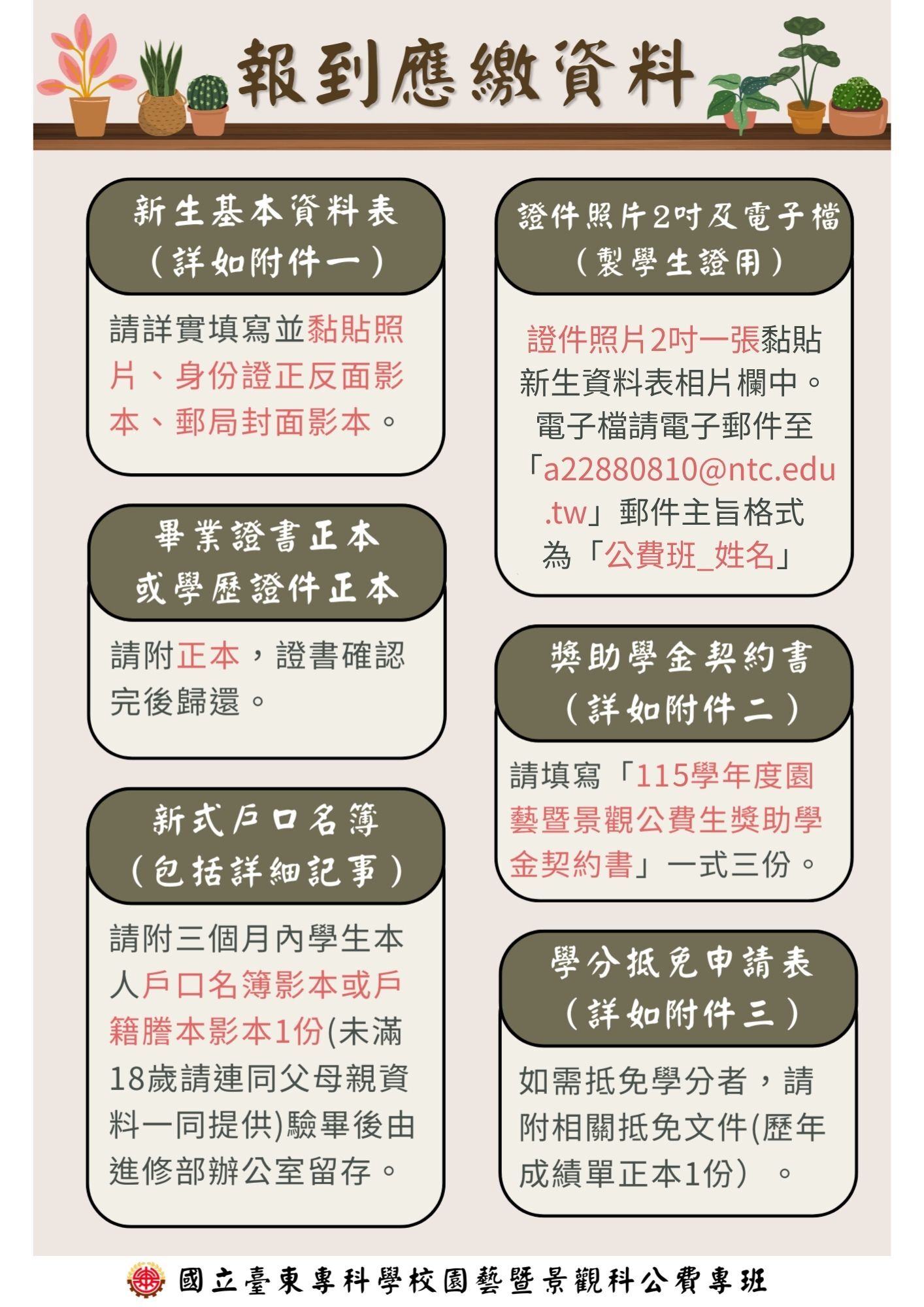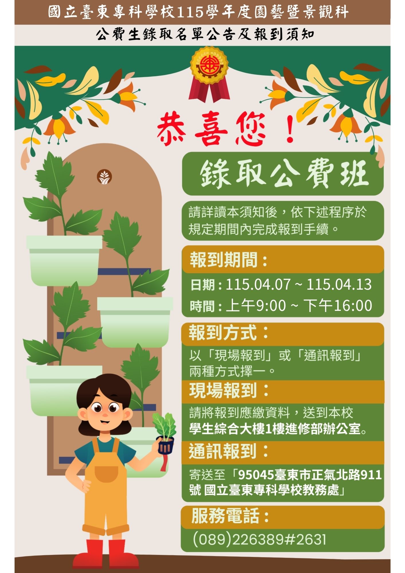 115學年度進修二年制園藝暨景觀副學士學位學程公費專班|錄取名單及報到須知