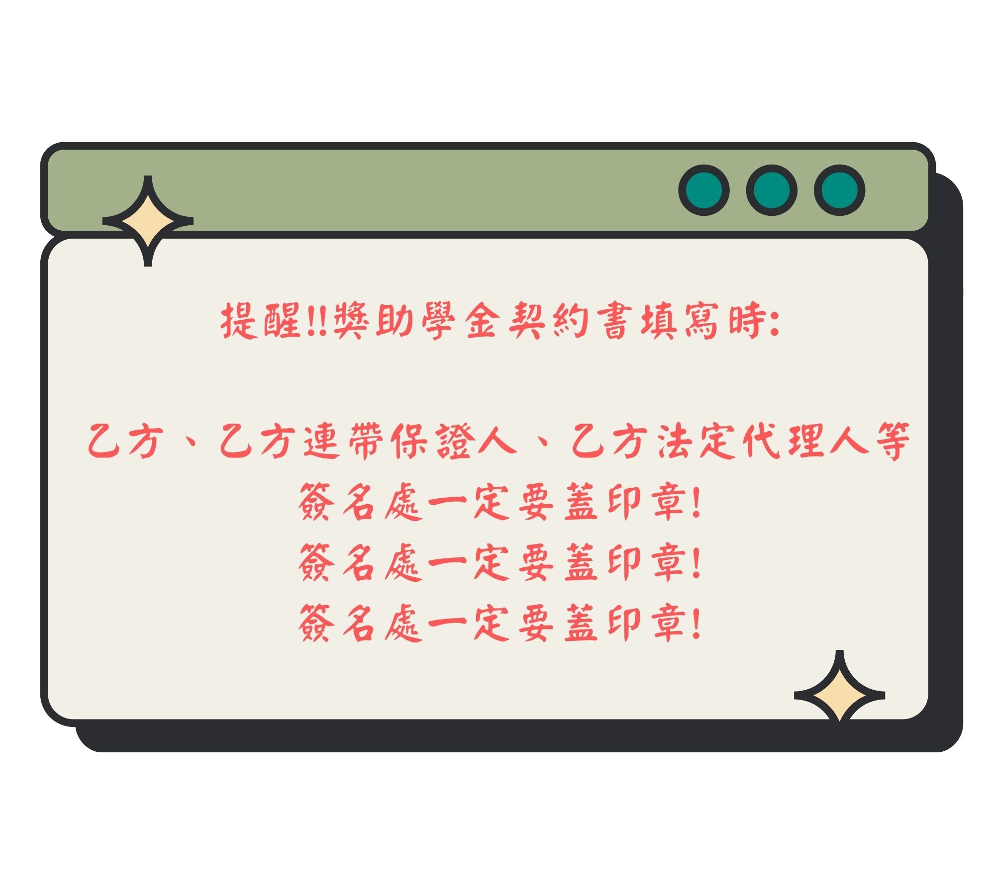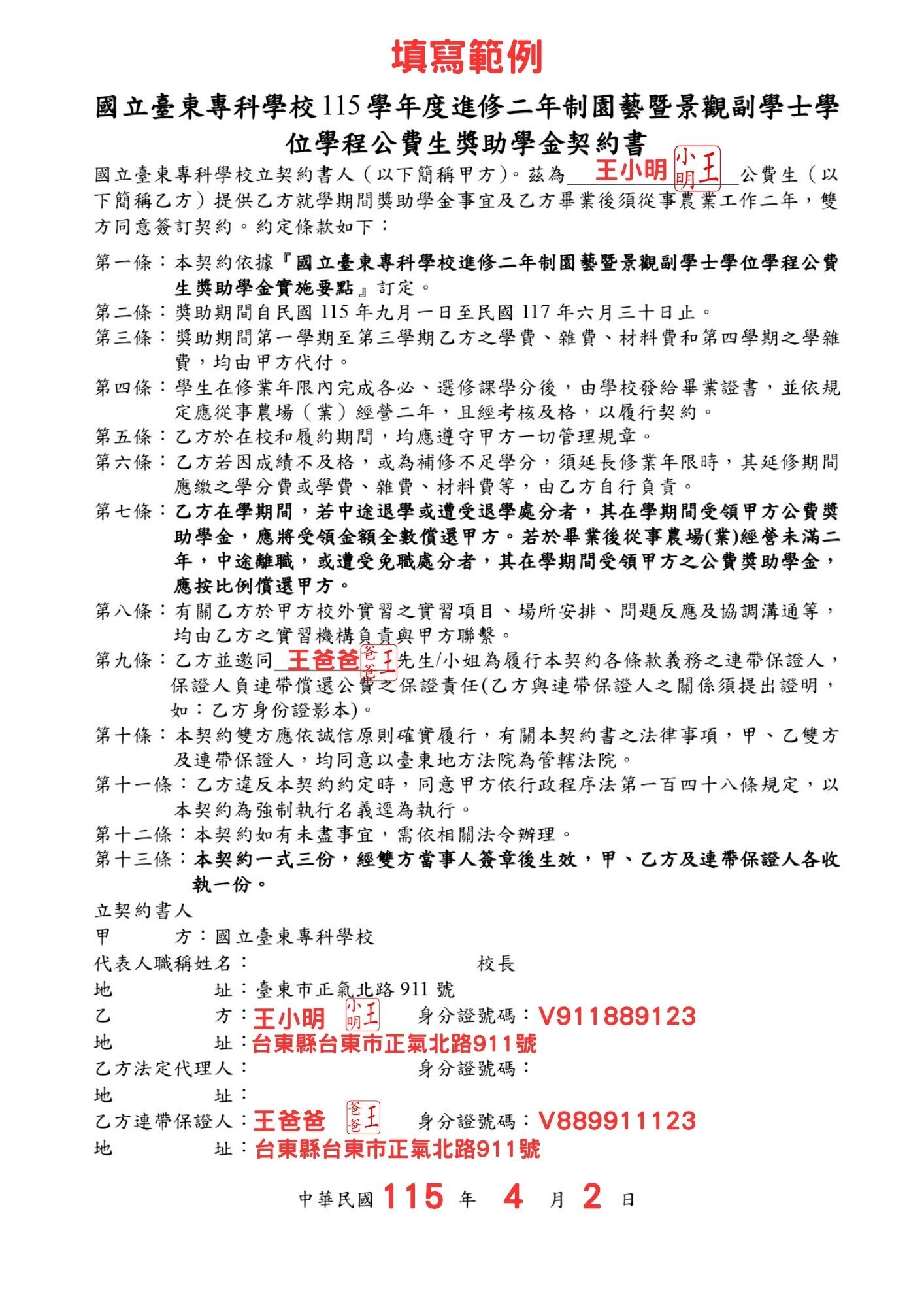 三、115學年度園藝暨景觀公費生獎助學金契約書一式三份(詳如附件二)請參考契約書填寫範例書寫,乙方、乙方連帶保證人、乙方法定代理人等簽名處一定要蓋印章!簽名處一定要蓋章!簽名處一定要蓋章!簽名處一定要蓋章!