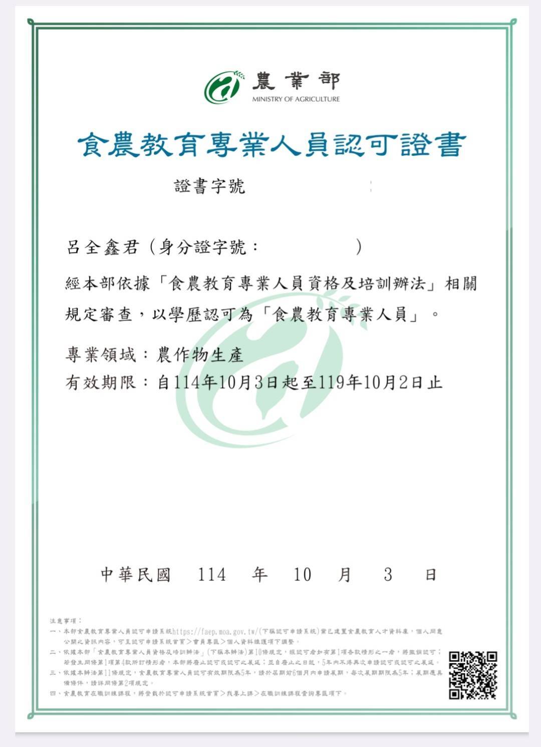 恭賀🎉本科公費班呂全鑫同學考取「食農教育專業人士認可書」