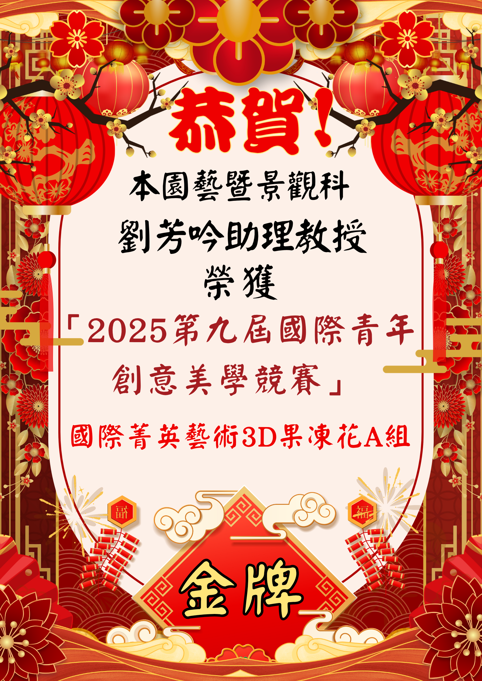 恭賀本科 劉芳吟助理教授 參加「2025 第九屆國際青年創意美學競賽 — 國際菁英藝術 3D 果凍花」榮獲 國際菁英藝術 3D 果凍花 A 組金牌,並同時榮登 國際菁英組 ─ 卓越國際碩學講師 殊榮!